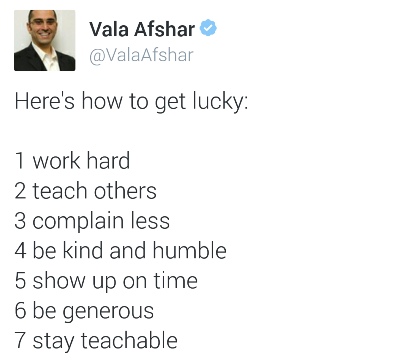 Again, what I truly believe is that you have to set yourself up to be in the right place at the right time. It takes hard work, vision, generosity and networking to get there. To dig into this further, I’m going to once again call upon my favorite person on Twitter, Vala Afshar – the Chief Marketing Officer for Extreme Networks, author of The Pursuit of Social Business Excellence, host of CxOTalk and blogger for the Huffington Post and Inc Magazine. I wrote a blog post about Why Your Best Employees Leave, which was also based on one of his tweets. He tweeted something that I identified very closely with, so again, I was inspired to write about it. Here is the tweet:
