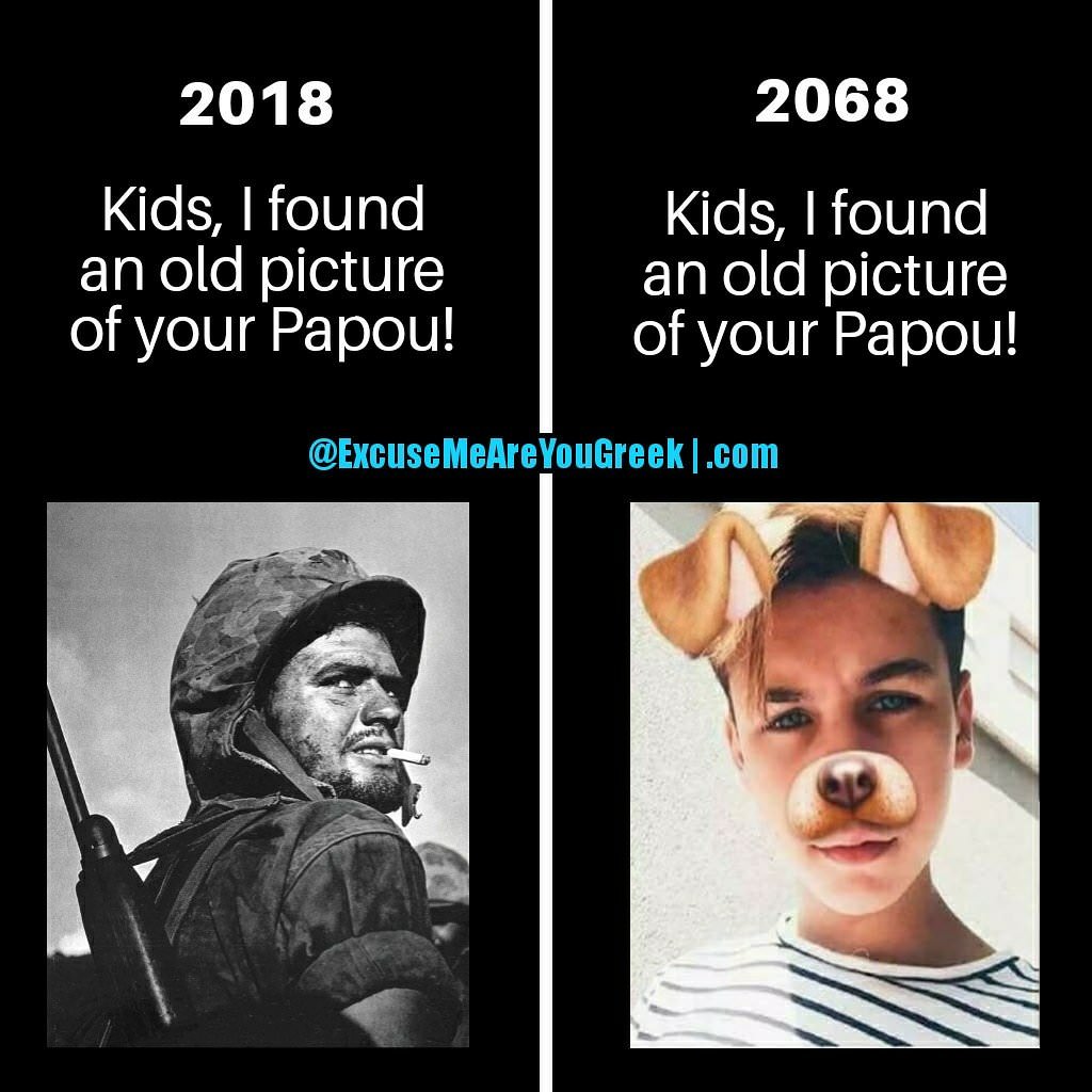 Memes Found An Old Picture of Papou Gotta love Snapchat filters. I’m guilty of it too, anyone else? You can admit it. But at least I have kids. 😂😁👌🇬🇷 (FB: BelenCorso)